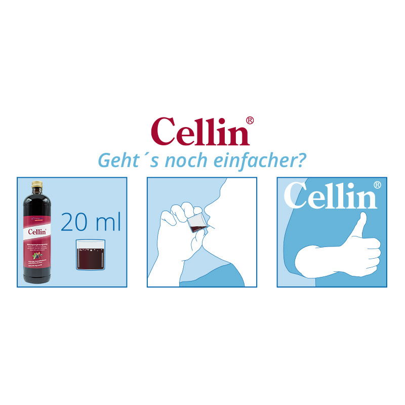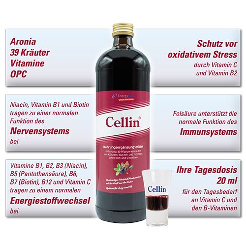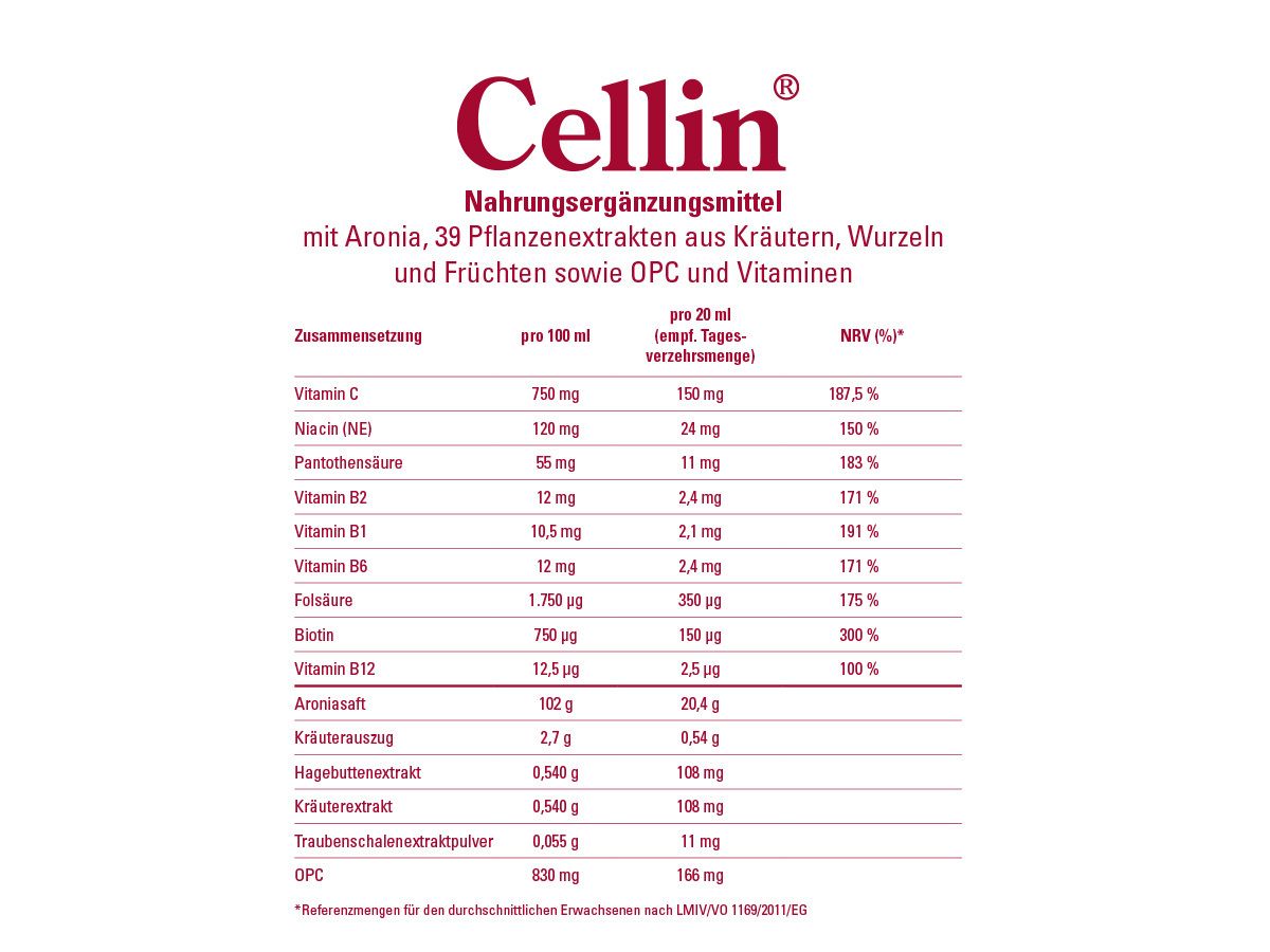 - Cellin versorgt Ihren Körper mit hochwertigen Vitalstoffen; 20 ml decken Ihren Tagesbedarf an Vitamin C und den B Vitaminen B1, B2, Niacin (B3), Pantothensäure (B5), B6, Biotin (B7), Folsäure (B9).