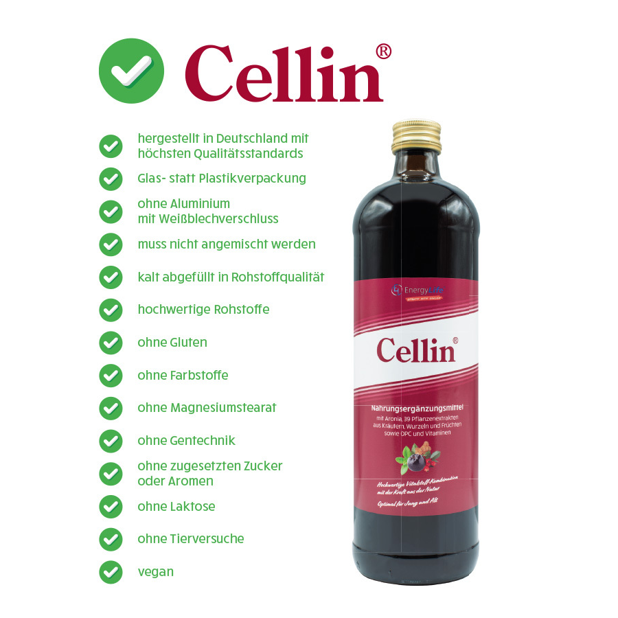 - Für maximale Haltbarkeit werden rein natürliche Stoffe zur Konservierung eingesetzt. Und um die optimale Natur-Kraft der beinhalteten Vitalstoffe zu erhalten, wird Cellin konsequent kalt abgefüllt – und das seit der ersten Flasche im Jahr 2004.